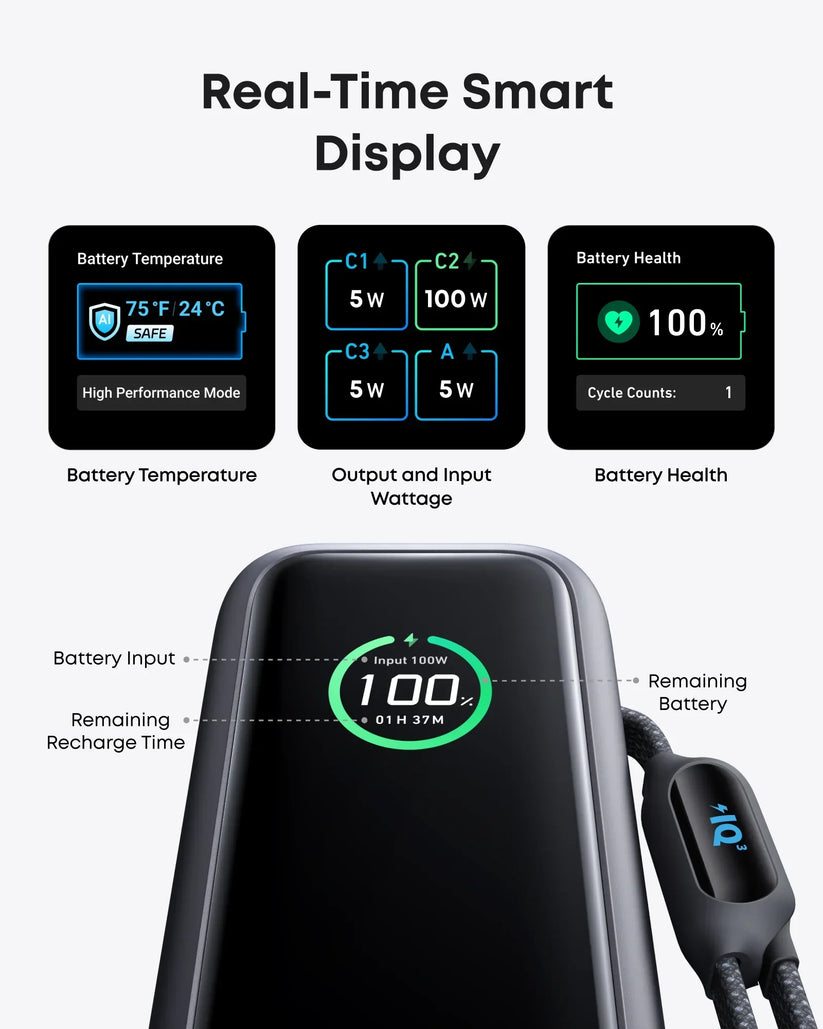 Urmărește bateria rămasă, puterea, consumul, timpii de reîncărcare și multe altele cu un afișaj inteligent care oferă actualizări în timp real.