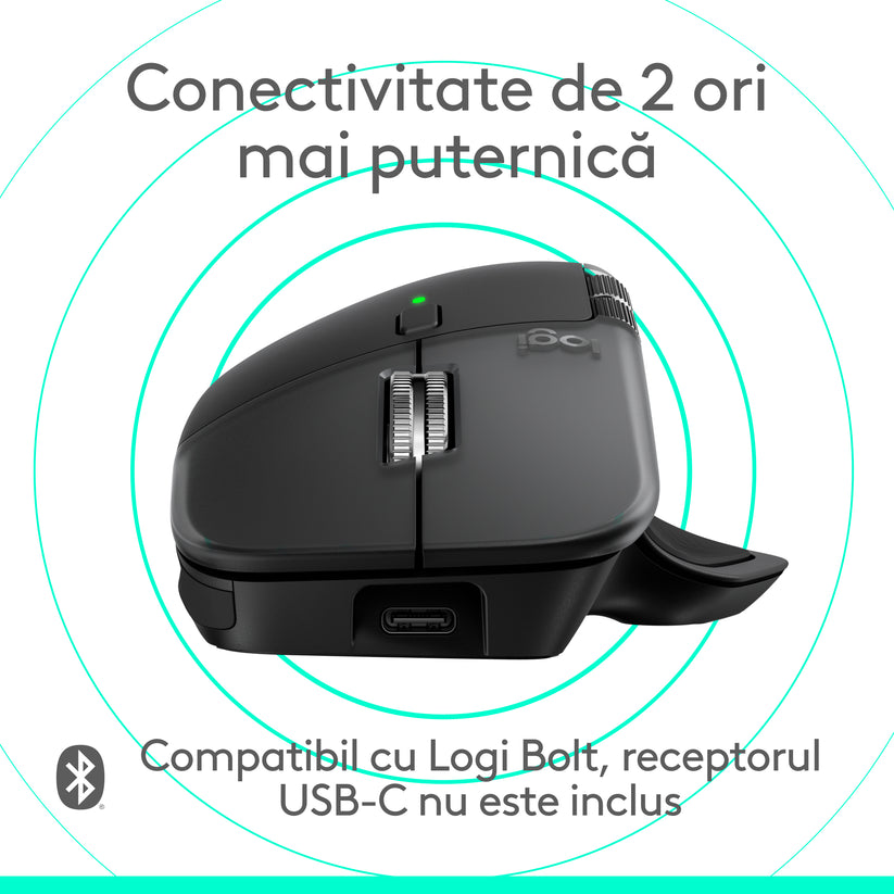 Logitech MX Master 4 aduce un control imersiv și precizie pe care o poți simți prin feedback haptic. Experimentează feedback haptic la acțiuni specifice, scurtături, notificări precum schimbarea desktop-urilor, ajustări de slider și multe altele. Personalizează intensitatea vibrațiilor în Logi Options+ (1). Cu scurtăturile Actions Ring și MX Master 4, economisești până la 33% din timp (2) prin accesarea uneltelor și filtrelor direct de la cursor, reducând mișcările repetitive cu până la 63% (2). Experimentează performanță neîntreruptă cu o conectivitate de 2X mai puternică, alimentată de un cip radio avansat, o poziționare optimizată a antenei și un nou dongle USB-C. (7)